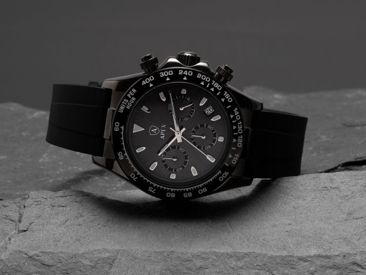 The high-contrast dial features sharp sub-dials and luminous markers, framed by a bold tachymeter bezel that echoes the dials of classic race instruments. Housed in a gunmetal case, every detail is engineered for clarity and control - because timing is everything when you’re on the move.